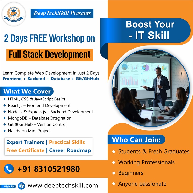 Unlock your career potential with our Full Stack Development training program designed to make you job-ready in today’s competitive IT industry. This course covers everything from frontend technologies like HTML, CSS, JavaScript, and React, to backend development with Node.js, Express, and databases such as MySQL and MongoDB. Learn Full Stack Development and master both frontend & backend technologies with hands-on projects. Build real-world web applications and boost your IT career with expert guidance and placement support. Expert Trainers | Practical Skills | Free Certificate | Career Roadmap Who Can Join? Students & Fresh Graduates Working Professionals Beginners Anyone passionate about IT Limited seats available! Register today: Call: +91 8310521980 Mail Us: info@deeptechskill.com Address: Doddabele Kengeri Bangalore - 560040 Visit: www.deeptechskill.com ![]() | |