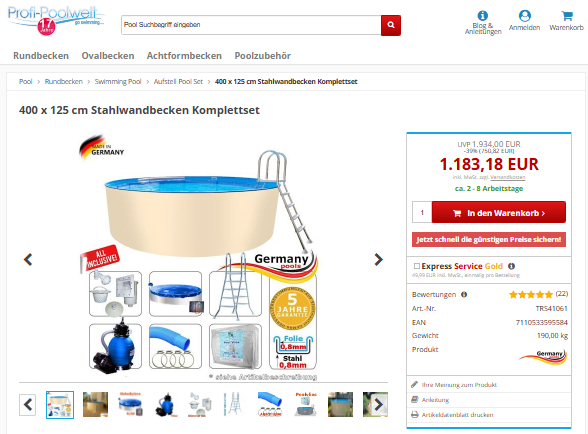 400 x 125 cm Stahlwandbecken Komplettset 4,00 x 1,25 m Aufstellbecken Komplett Set Stahlwandpool rund Bausatz Swimmingpool 400 freistehend Schwimmbecken ohne Bodenplatte aufbauen einlassen Rundpool 4 Stahl Pool Stahlwandbecken vollversenkt ![]() | |